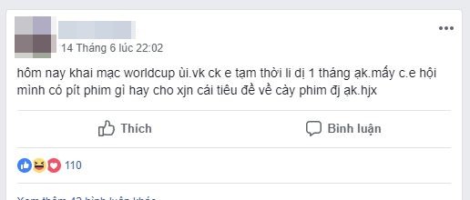 "Hôm nay khai mạc World Cup rồi. Vợ chồng em tạm thời ly dị 1 tháng ạ. Mấy chị em có biết phim gì hay cho em xin cái tiêu đề về cày đi ạ!", một chị vợ chia sẻ. (Ảnh chụp màn hình)