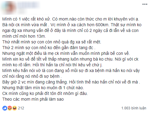 "Mình có 1 việc rất khó xử. Mom nào cho mình lời khuyên với ạ. Bà nội chồng mình vừa mất mà vợ chồng mình ở xa cách hơn 600km. Thật sự mình không ngại đường xa nhưng vấn đề ở đây là mình chỉ có 2 ngày cả đi lẫn về và con mình chỉ mới hơn 13 tháng. Thứ nhất mình sợ con còn nhỏ quá đường xa sẽ rất mệt. Thứ hai mình sợ con nhỏ không đến gần đám tang được. Nhưng ngặt một điều là mẹ chồng mình vẫn muốn mình phải bế con về.