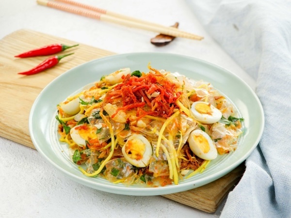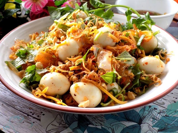- Cho tất cả ra dĩa, cho ruốc thịt heo, khô bò, xoài và đậu phộng, trứng cút còn lại lên trên cùng và dọn ra thưởng thức.