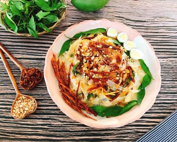 Món bánh tráng trộn mềm và dai, có vị khô mặn mà, vị chua ngọt của xoài và đặc biệt hơn khi được trộn cùng sa tế tôm.