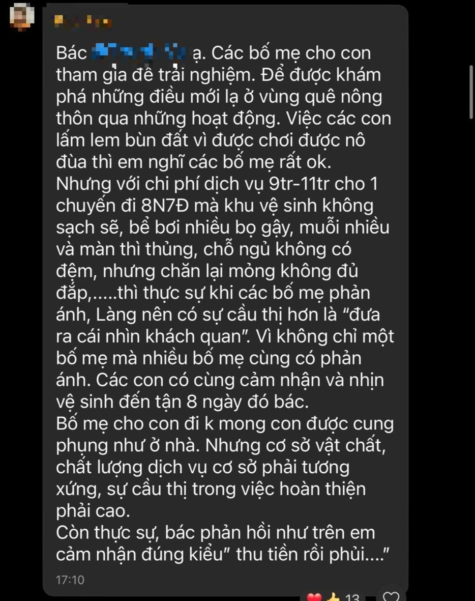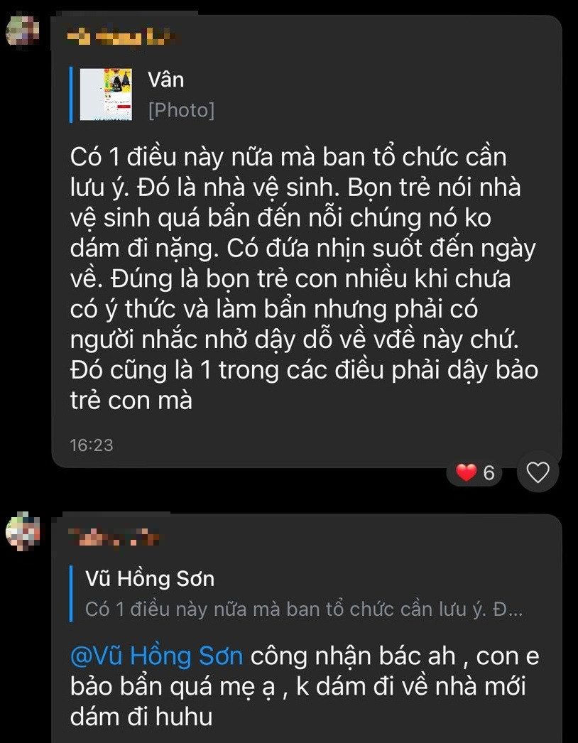Dưới bài đăng của chị L., nhiều phụ huynh khác bình luận phản ánh vệ sinh và dịch vụ của khóa trại hè này. Tài khoản Huyền Trang viết: "Con mình và nhiều bạn trong đoàn về bị đi ngoài".