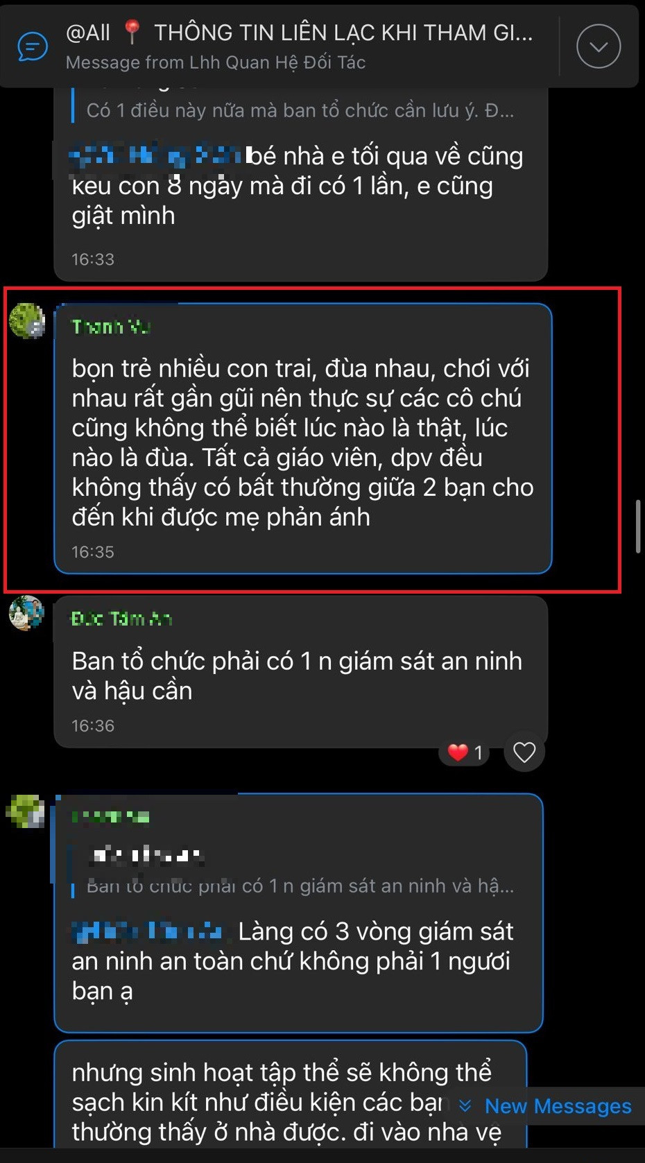 Theo hình ảnh chụp màn hình do chị L. cung cấp, khi chị phản ánh về việc con trai bị bắt nạt, BTC phản hồi: "Bọn trẻ nhiều con trai, đùa nhau, chơi với nhau rất gần gũi nên thực sự các cô chú cũng không thể biết lúc nào là thật, lúc nào là đùa.