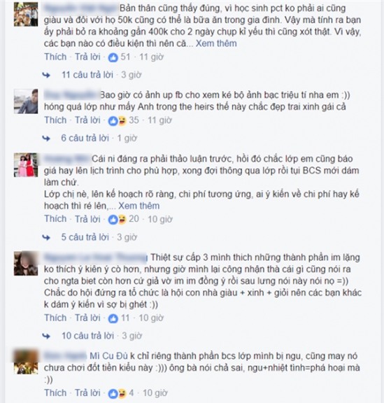 Còn thêm chi phí photo ảnh các thứ. Thế là 2 ngày huy hoàng chụp kỷ yếu và nửa tháng chờ đợi, chi phi hết 17 triệu 6 trăm 40 ngàn. Sao tiền giống giấy quá vậy? Ai chửi hộ bọn ban cán sự lớp mình giúp với, tiền cha tiền mẹ bán mặt cho đất bán lưng cho trời nộp vào để hội rich kids lên kế hoạch kỷ yếu gần 18 triệu? Nghĩ lại sao tiếc cũng không tiếc mà tức cũng không tức, như vô hồn vậy, trơ người luôn rồi."- thành viên lớp này viết.