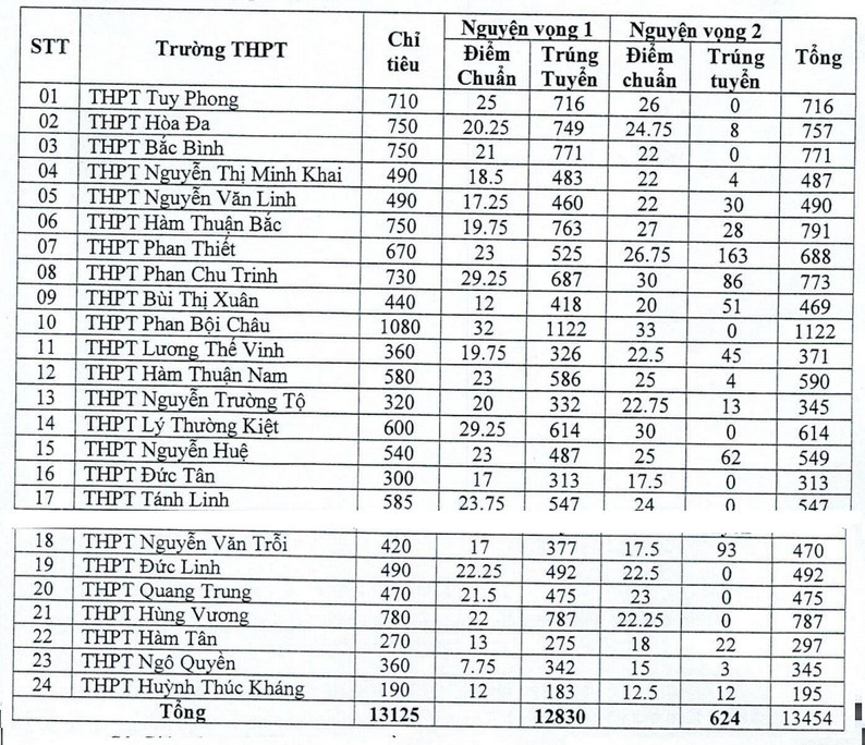 Một số trường khác cũng lấy điểm chuẩn thấp như Trường THPT Huỳnh Thúc Kháng hay Trường THPT Bùi Thị Xuân lấy 12 điểm, Trường THPT Hàm Tân lấy 13 điểm... Thí sinh cần đạt trung bình 2,4 – 2,6 điểm/môn là có thể trúng tuyển.