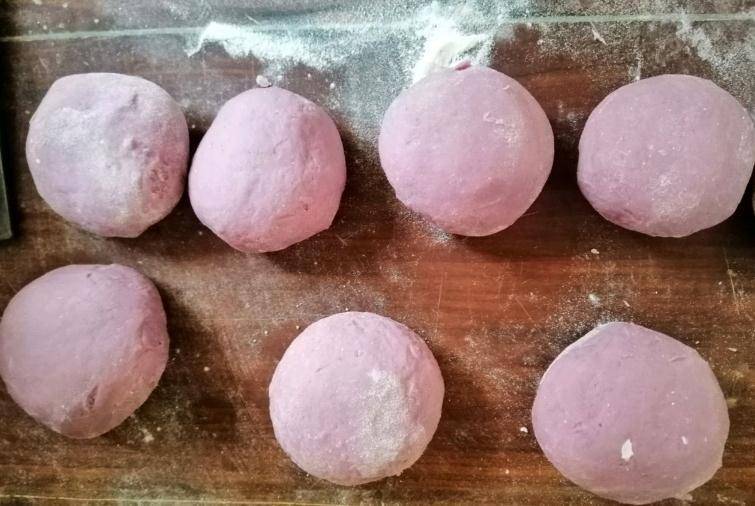 Với nguyên liệu như trên, chúng ta sẽ chia ra nhồi hai phần bột trắng và tím.