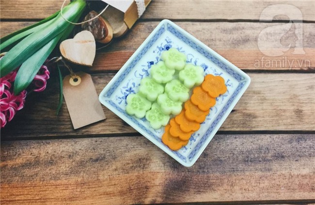 Dưa leo, cà rốt rửa sạch, gọt vỏ, cắt khoanh dầy 2cm. Có thể tỉa hoa hoặc dùng khuôn cắt thành các hình dáng đẹp mắt cho món canh thêm sinh động.
