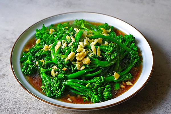 Cho rau súp lơ ra đĩa, đổ nước xốt vừa đun lên trên là xong.