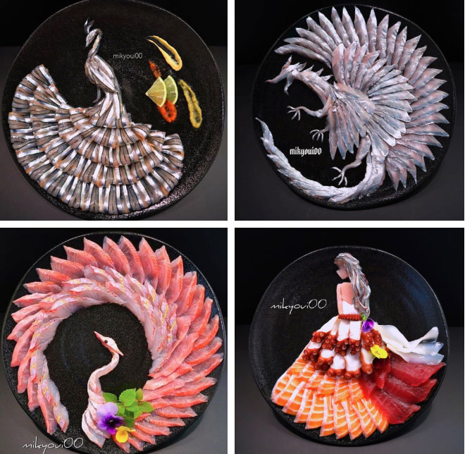 Những lát cá, bạch tuộc... đơn điệu được anh sắp xếp một cách tài tình, thẩm mỹ biến chúng thành những hình thù sống động. Nào là cô gái xinh đẹp mặc chiếc váy đỏ lộng lẫy, nào là nàng tiên trong truyện cổ tích, rồi thì lại là bạch mã, con rồng, con phượng...
