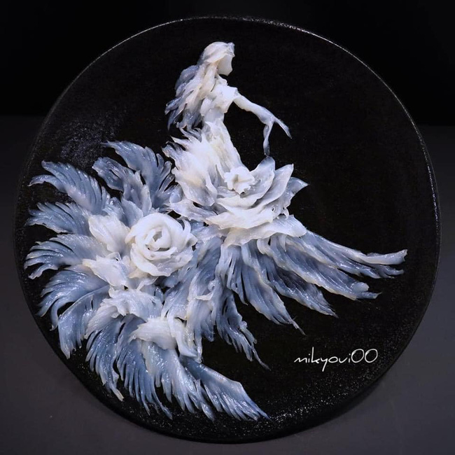 Hẳn bạn sẽ bất ngờ khi biết toàn bộ cô gái và váy áo này được làm từ những lát mực xắt mỏng?