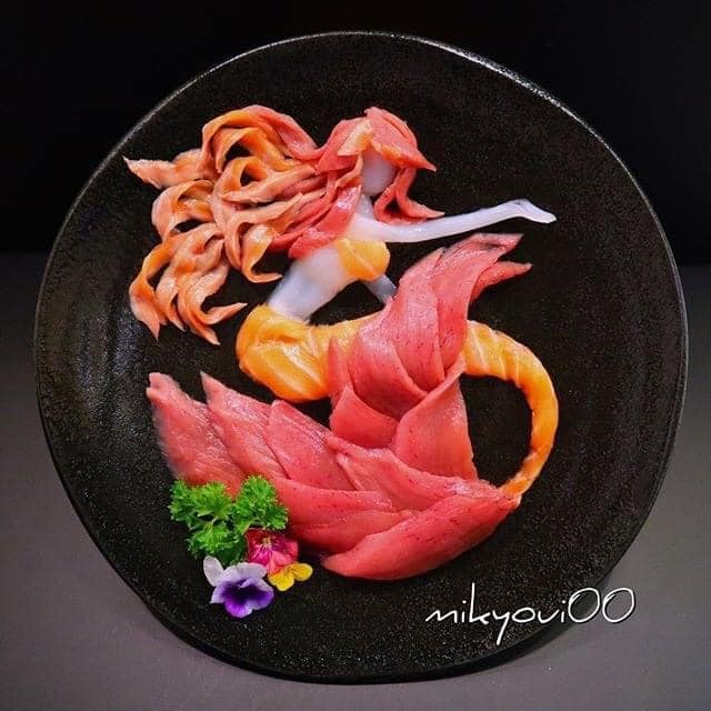 Nàng tiên cá lỗng lẫy sắc màu được tạo hình từ cá ngừ và cá hồi.