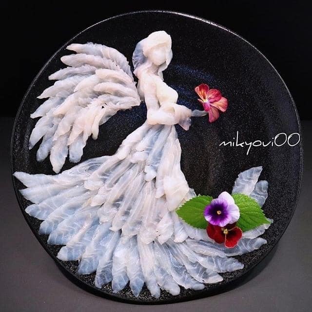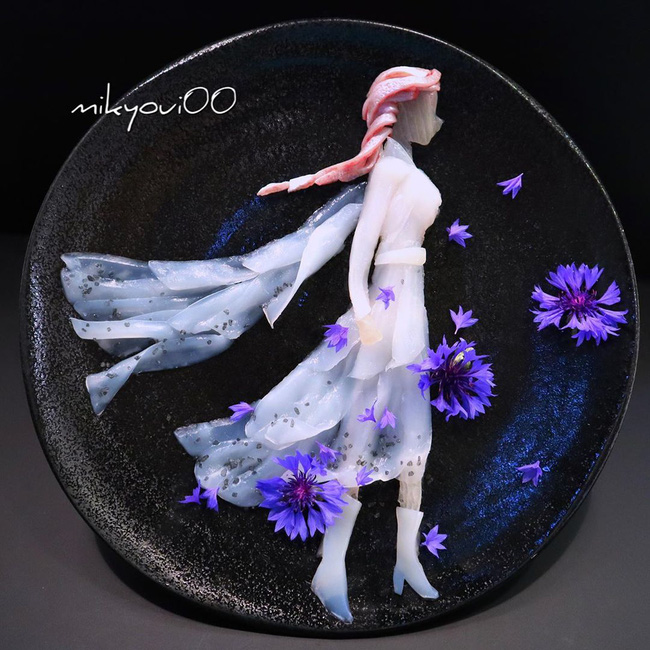 Nhân vật thiếu nữ trong truyện tranh Nhật Bản được tạo thành với phần váy áo lộng lẫy từ những lát cá hồi với họa tiết bắt mắt.