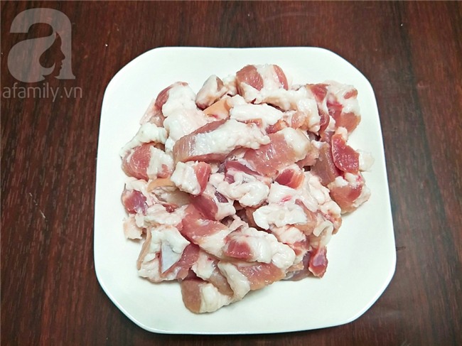 Thịt ba chỉ cạo sạch bì rồi rửa lại sạch sẽ sau đó thái miếng vừa ăn.