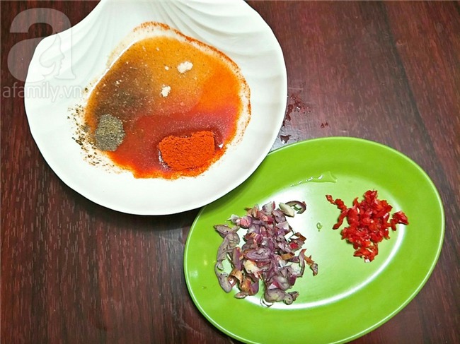 Ớt sừng băm nhỏ, hành khô băm nhỏ, các loại gia vị cho vào bát khuấy đều.