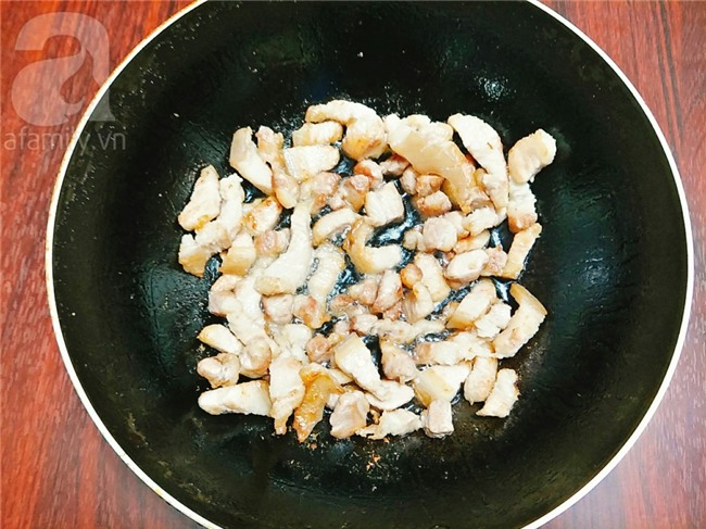 Cho thịt ba chỉ vào chảo, bật bếp rang cho thịt ra bớt mỡ và hơi xém vàng thì xúc thịt ra đĩa.