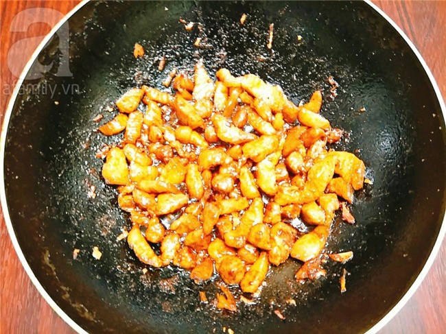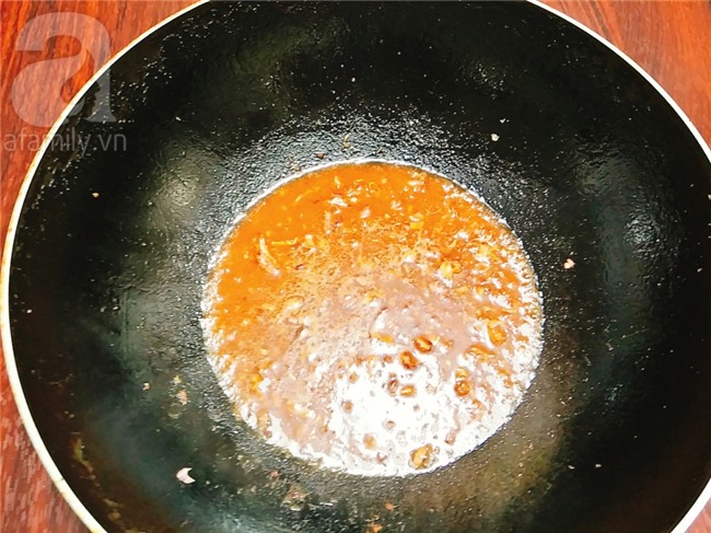 Để lại 1 ít nước mỡ trong chảo sau đó cho hành khô vào phi cho thơm, tiếp đến cho bát gia vị vào đun cho sôi lên.
