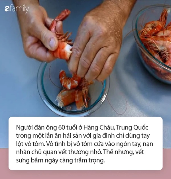 Vô tình bị vỏ tôm cứa vào ngón tay khi bóc tôm, nạn nhân chủ quan vết thương nhỏ, dẫn đến hậu quả đáng tiếc.