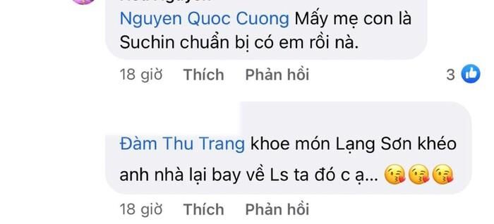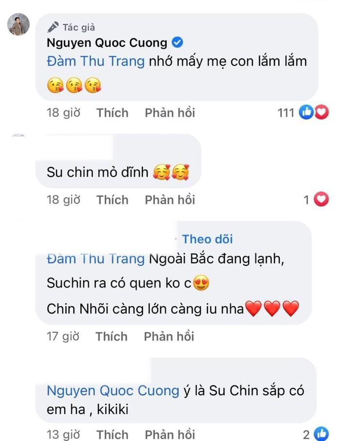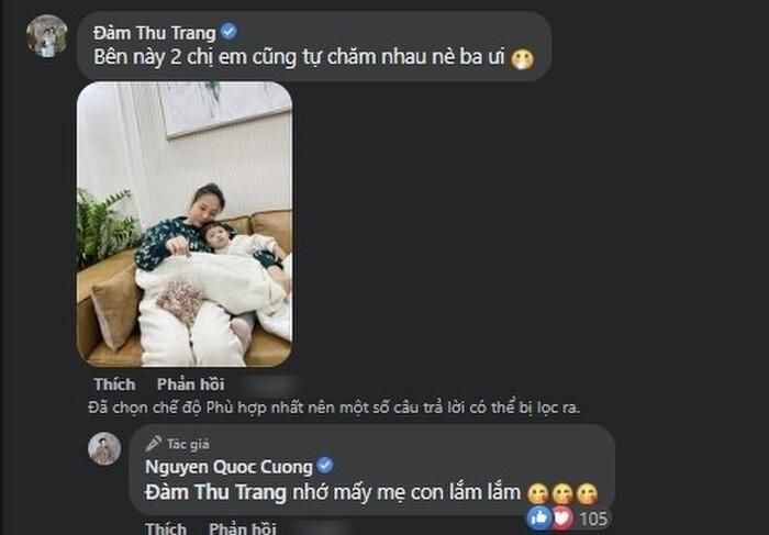 Phía dưới bài viết, Đàm Thu Trang cũng đăng tải hình ảnh cùng Suchin đang ở nhà ngoại tại Lạng Sơn. Cựu người mẫu cùng hài hước viết rằng: "Bên này 2 chị em cũng tự chăm nhau nè ba ơi". Ngay sau đó, Cường Đô La cũng nhanh chóng tương tác qua lại với bà xã: "Nhớ mấy mẹ con lắm lắm".