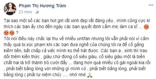 Không chỉ có đả kích từ cư dân mạng, Hương Tràm còn có lời "nhắn nhủ vu vơ" trên mạng xã hội trong thời điểm nhạy cảm. Chia sẻ của nữ HLV Giọng hát Việt nhí ngay sau đó làm dậy sóng cộng đồng mạng. Hương Tràm bức xúc và cảm thấy nghề nghiệp bị xúc phạm khi có những hot girl không biết hát mà vẫn ra sản phẩm âm nhạc.