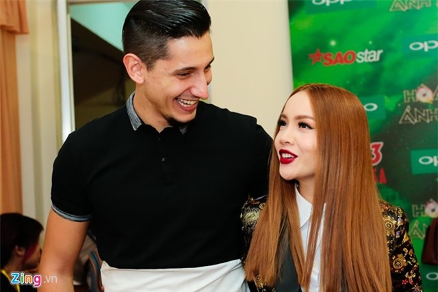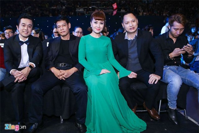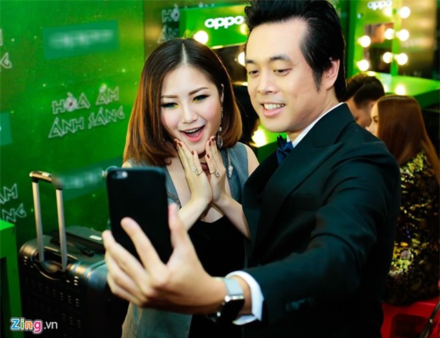 | Nữ ca sĩ chụp ảnh kỷ niệm cùng giám khảo Dương Khắc Linh. |