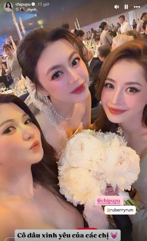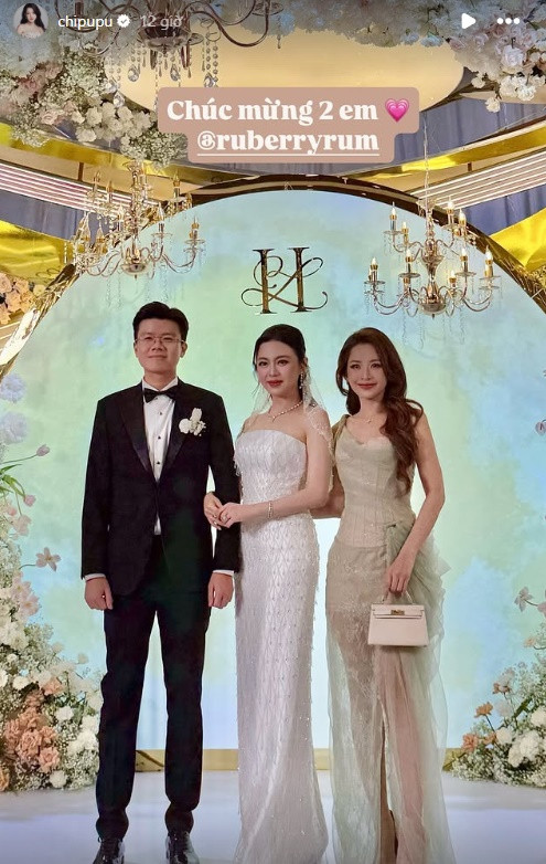 Sau đó, Khánh Linh thay bộ váy cưới đơn giản phom cúp ngực để đi bàn và chụp ảnh cùng khách mời. Chi Pu cũng là một trong những người chị em thân thiết với cô dâu. Giọng ca "Đóa Hoa Hồng" khoe visual xuất sắc khi diện chiếc đầm xẻ đùi sánh đôi cùng cô dâu - chú rể.