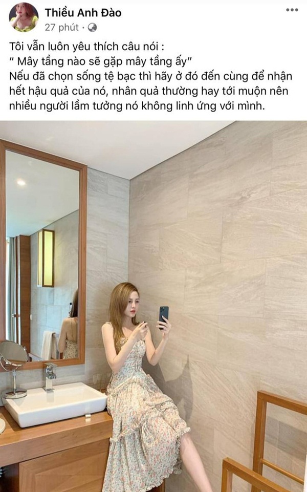 Cách đây ít lâu, Thiều Anh Đào đăng status nói về chuyện mây tầng nào gặp mây tầng đó và ám chỉ ai đó sống tệ bạc nhưng cũng xoá ngay sau đó.