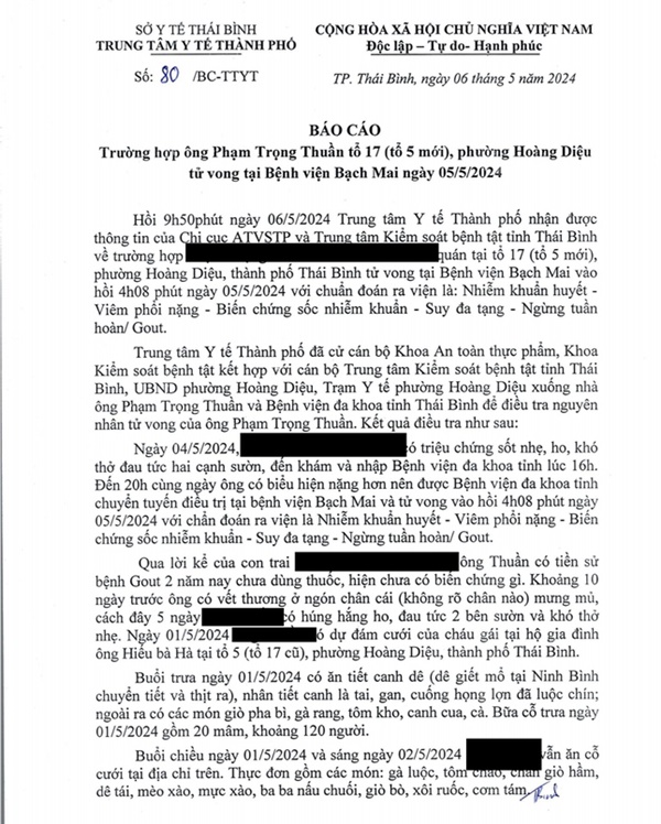 Qua xác minh ban đầu cho thấy, 16h ngày 4/5, ông P.T.T (SN 1957) là người có tham gia ăn các bữa cỗ nói trên có triệu chứng sốt nhẹ, ho, khó thở, đau tức hai bên sườn phải, đã đến khám và nhập Bệnh viện Đa khoa tỉnh Thái Bình điều trị. Khoảng 10 ngày trước đó, ông T., có vết thương ở ngón chân cái (không rõ bên nào) bị mưng mủ.
