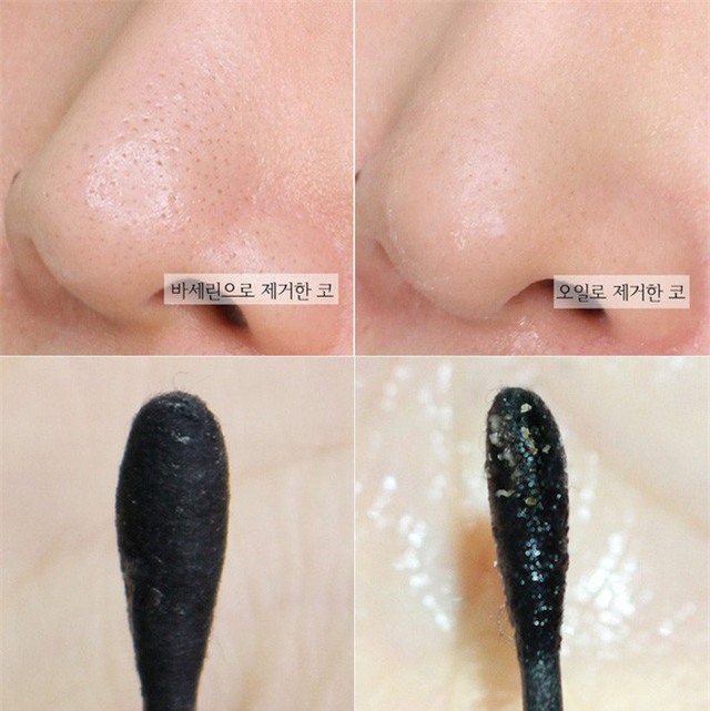 Lúc này da mềm nên rất dễ đẩy hết sợi bã nhờn ra khỏi lỗ chân lông, bạn có thể thấy rõ bụi bẩn, bã nhờn đã bám trên miếng tăm bông.