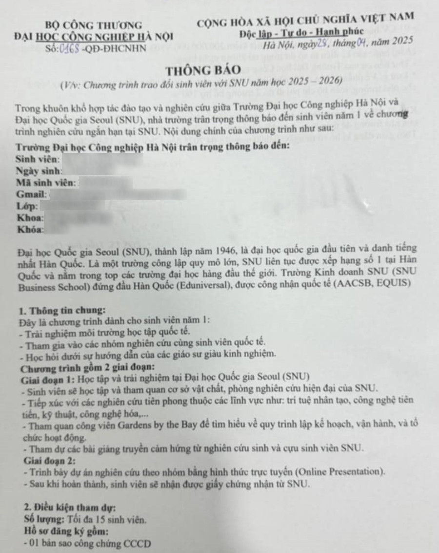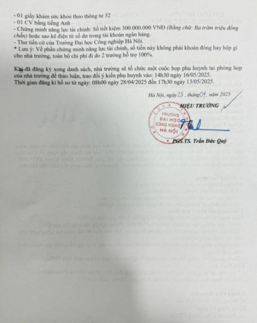 Sau đó, N. nhận được thông báo giả đủ điều kiện ghi danh vào khoá du học, có con dấu, chữ ký của hiệu trưởng trường đại học. Trong thông báo có yêu cầu phải chứng minh năng lực tài chính. N. cho biết đối tượng giới thiệu, khả năng tài chính càng lớn, mức học bổng gồm sinh hoạt phí và học phí nhận được càng cao. Việc du học cũng có thể kéo dài trong 4 năm thay vì 2 tháng như thông báo.