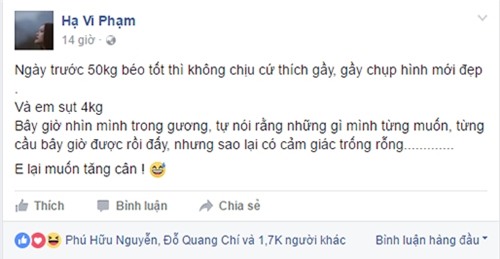 Mới đây, trên trang cá nhân, Hạ Vi cũng “kêu cứu” vì bản thân bị sụt cân một cách không kiểm soát: “Ngày trước 50kg béo tốt thì không chịu cứ thích gầy, gầy chụp hình mới đẹp. Và em sụt 4kg. Bây giờ nhìn mình trong gương, tự nói rằng những gì mình từng muốn, từng cầu bây giờ được rồi đấy, nhưng sao lại có cảm giác trống rỗng… Em lại muốn tăng cân”.