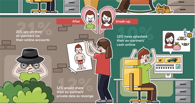 Nghiên cứu cũng cho biết, đối với những người đã có kinh nghiệm chia tay người yêu, 12% trong số họ đã chia sẻ hoặc muốn chia sẻ công khai các thông tin riêng tư của người yêu cũ như là một hành động trả thù và 21% đã theo dõi người yêu cũ thông qua các tài khoản trực tuyến mà họ đã từng truy cập. Cũng có những khả năng ảnh hưởng tài chính khi mà 10% người thừa nhận là đã xài tiền của người yêu cũ mua sắm trực tuyến.