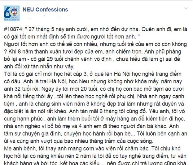 Đỉnh điểm là hôm đi chợ cùng người yêu với mấy bạn cùng phòng. Đến hàng thịt lợn em hô to: "Nấy năm nạng nòng nợn" - cái câu định mệnh của đời em ạ. Hôm sau thì chắc mọi người cũng đoán được rồi đấy, tin nhắn đến: "Mình với cậu không hợp nhau đâu...".