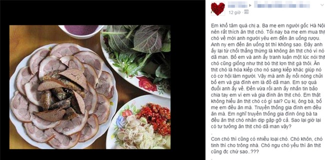 Cũng lại là chó, nhưng lí do chia tay của cô gái này lại đắng lòng hơn nhiều. Cô chia sẻ: "Ba mẹ em người gốc Hà Nội nên rất thích ăn thịt chó. Tối nay ba mẹ em mua thịt chó về mời anh người yêu em đến ăn uống rượu. Anh người yêu em đến ăn uống bình thường thì không sao. Đây anh ấy lại từ chối thẳng thừng là không ăn thịt chó vì nó dã man".