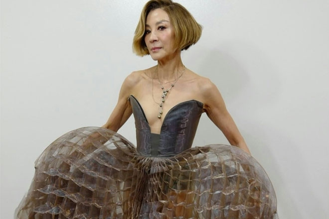 Trên sân bóng, Karina mặc váy đen ngắn với phần cổ khoét sâu, kết hợp cùng tất lưới cao đến đùi, đai giữ và găng tay dài qua khuỷu tay.