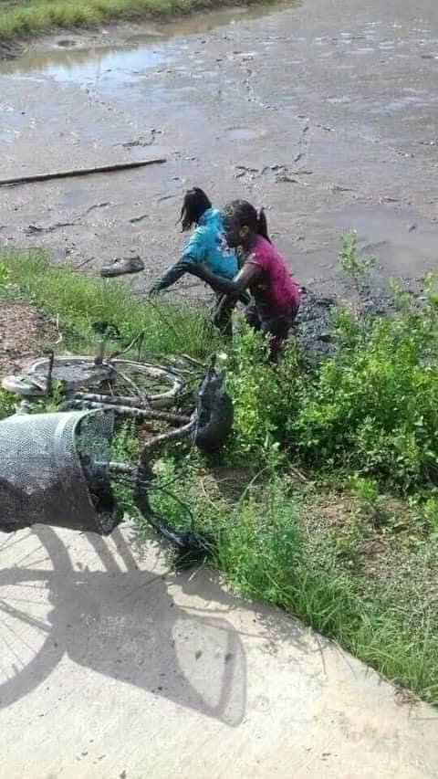 Cô nào cô nấy nhuốm đen vì bùn. Trong một bức ảnh, hai nữ sinh đang chật vật tìm cách lên bờ trong khi chiếc xe đạp bị biến dạng đáng kể.