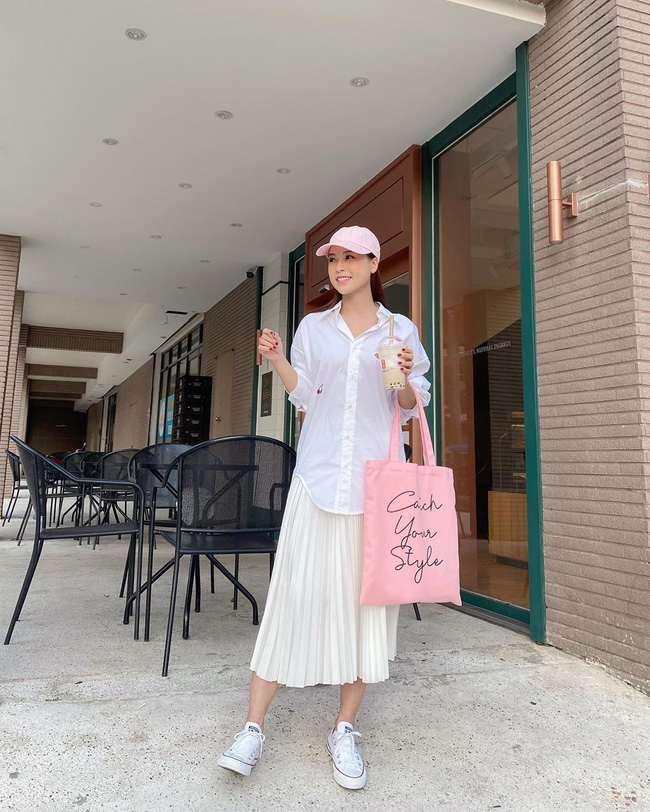 Bạn không nhất thiết phải máy móc diện cả một cây trắng toàn tập, việc mix quần trắng với áo màu be như cách Mỹ Linh hoàn thiện phong cách sẽ giúp set đồ thêm thú vị, đồng thời vẫn giữ được vẻ hiền hòa, trang nhã.