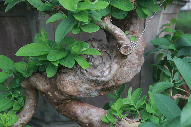 Không chỉ có dáng thế độc đáo, cây ổi còn nổi u cục lớn, phô diễn những đường cong ngoạn mục.