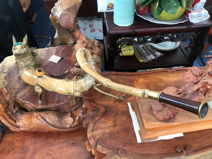 “Đây là chiếc điếu cày được làm từ cây tre nhiều năm tuổi, nó là một cây tre không hề chắp vá nên rất độc đáo và không bao giờ có một chiếc thứ 2 như vậy. Khá nhiều khách đến hỏi mua, tuy nhiên chưa được giá nên tôi chưa bán”, anh cho hay.