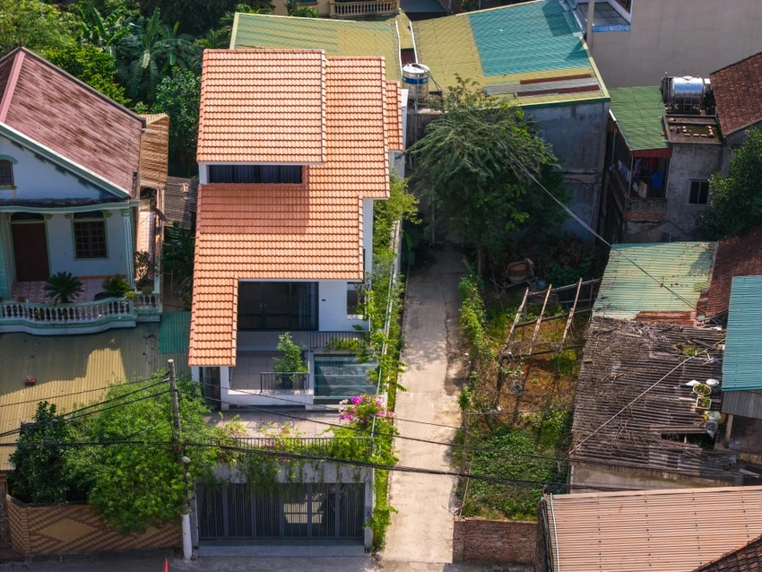 Ngôi nhà hình ziczac sử dụng mái ngói truyền thống, nội thất sử dụng tone màu tối tạo cảm giác mát mẻ.