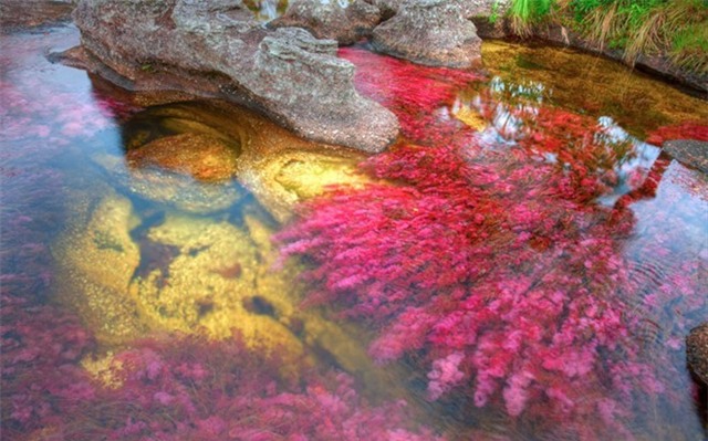 | 4. Sông Cano Cristales, Columbia: Thường được mệnh danh là “dòng sông ngũ sắc” hay dòng nước cầu vồng (Liquid Rainbow), con sông ở tỉnh Meta thuộc Columbia này xứng đáng là một trong những con sông đẹp nhất thế giới. Do có lượng tảo dày, từ tháng 7 đến tháng 11 dòng sông luôn phủ đầy màu sắc từ vàng, xanh lá, xanh dương, đen và đỏ. |