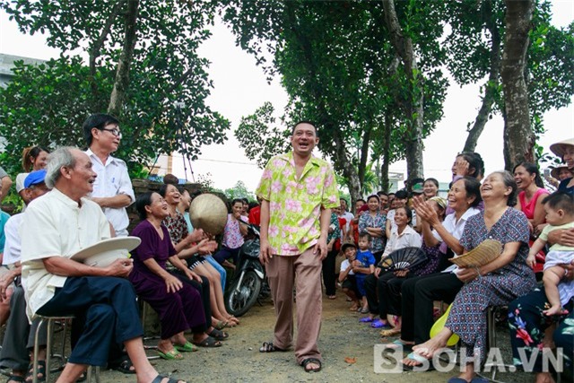 Anh đi tới đâu, bà con vây lấy anh cười nói, hỏi han rất vui vẻ. Bản thân "cây hài" cũng đáp lại một cách nhiệt tình với nụ cười không thể tươi tắn hơn.