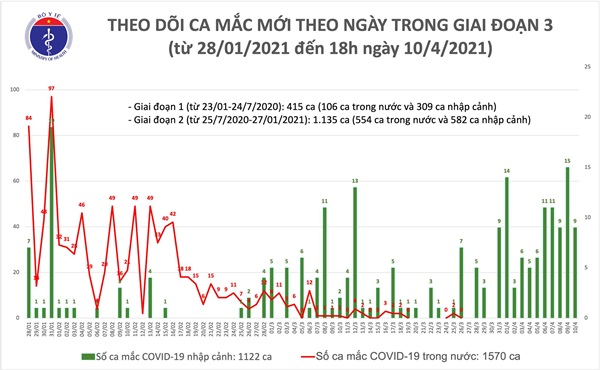 - Tính từ 6h đến 18h ngày 10/4: 9 ca mắc mới, đều là các ca được cách ly ngay sau khi nhập cảnh.