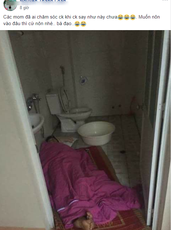 Đi kèm với đó là đôi dòng chú thích của chủ nhân những bức ảnh này: ''Các mom đã ai chăm sóc chồng như này chưa? Muốn nôn vào đâu thì cứ nôn nhé. Bá đạo''.