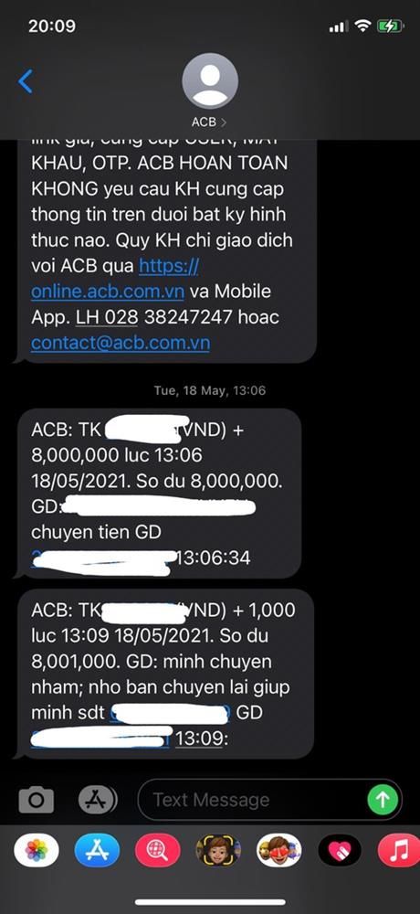 Giữa tháng 5 vừa qua, chị Hồng Ngọc (23 tuổi, TP.HCM) cho biết tài khoản ngân hàng ACB của chị đột nhiên được chuyển khoản 8 triệu đồng từ người lạ. Không lâu sau, người này tiếp tục chuyển thêm 1.000 đồng vào tài khoản của chị và nói là chuyển nhầm, xin chị Ngọc chuyển trả lại kèm.