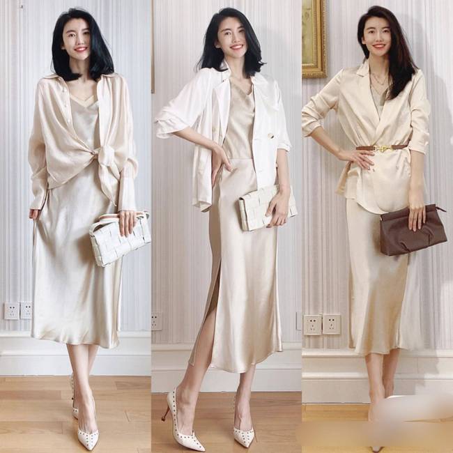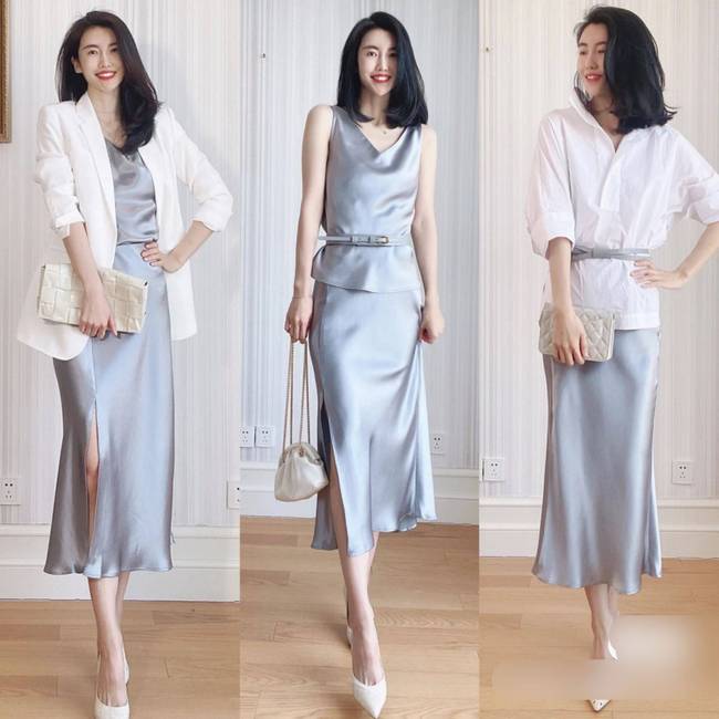 Khác với váy lụa đen, chị em đôi khi sẽ e ngại những mẫu váy lụa màu pastel hay những gam màu trắng sáng vì sợ lộ dáng thiếu thon thả. Nhưng không một khi biết những chiêu mix&match thú vị này thì ai diện lên cũng eo thon dáng chuẩn, cao thêm vài cm chứ chẳng ít.
