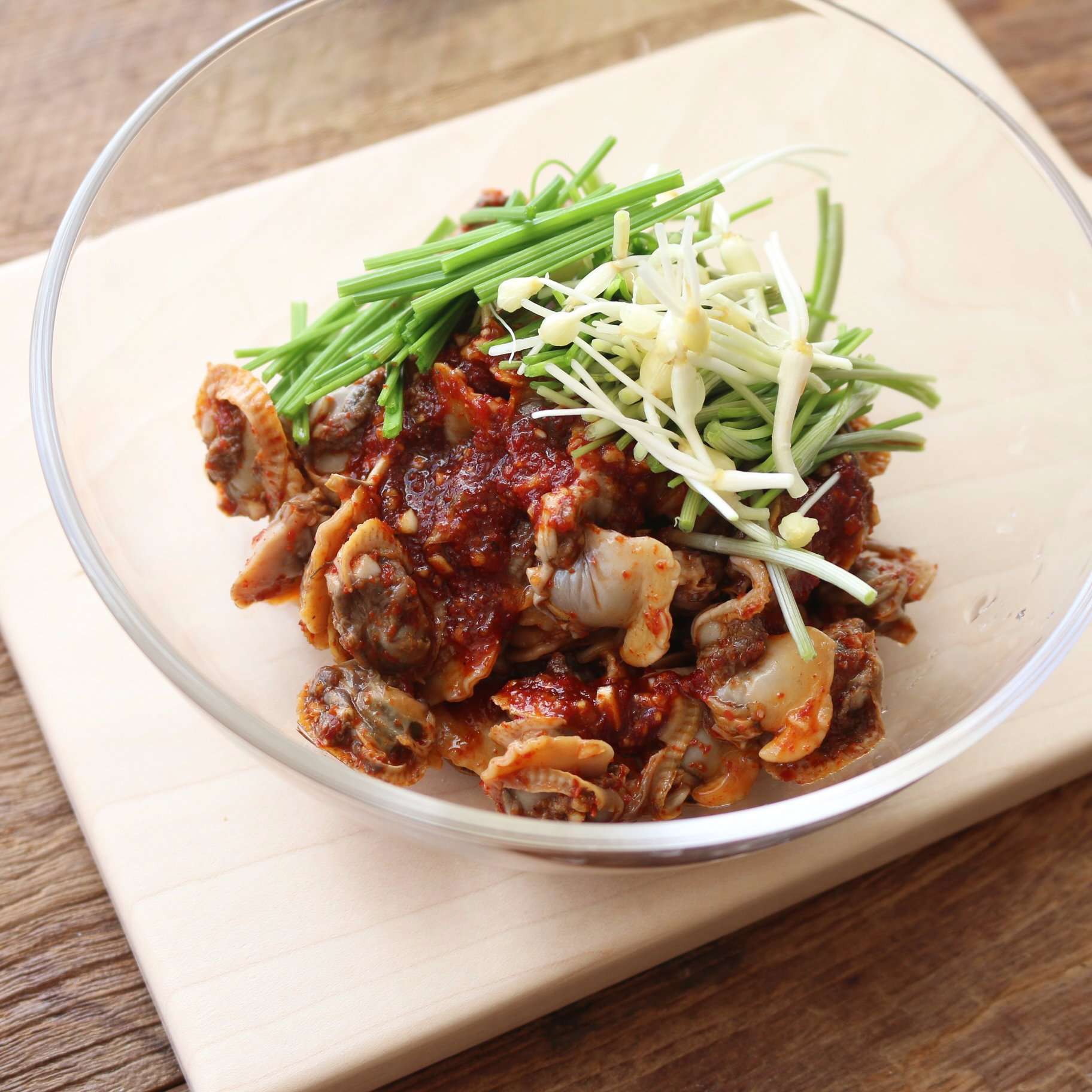 Cho thịt sò vào bát, thêm phần gia vị trộn và hành tăm vào trộn đều. Khi ăn lấy ra đĩa và rắc chút vừng rang lên trên là xong.