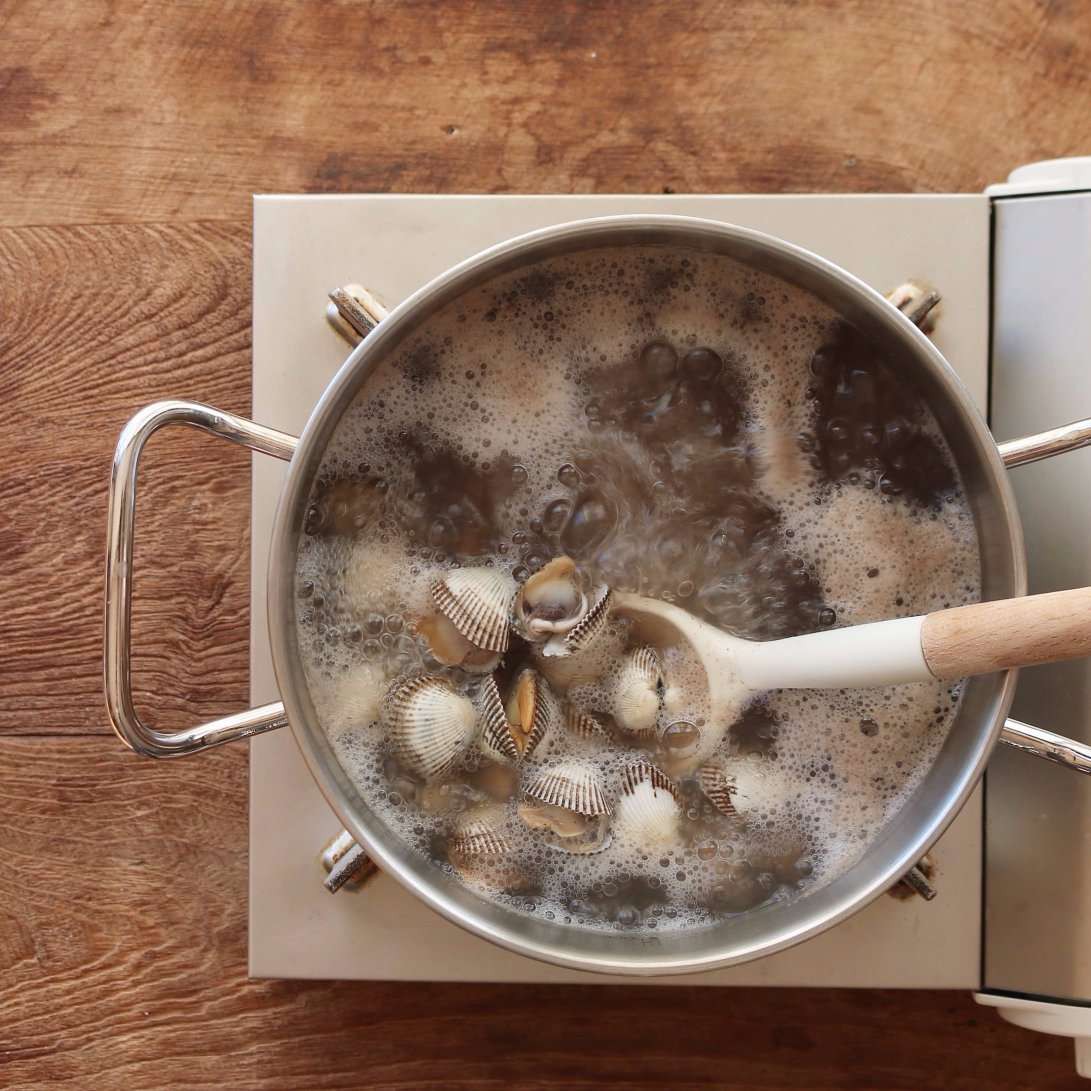 Sò rửa sạch. Đun sôi một nồi nước rồi hạ nhỏ lửa, cho sò vào rồi dùng muỗng khuấy đều theo một chiều cho đến khi sò chín mở miệng.
