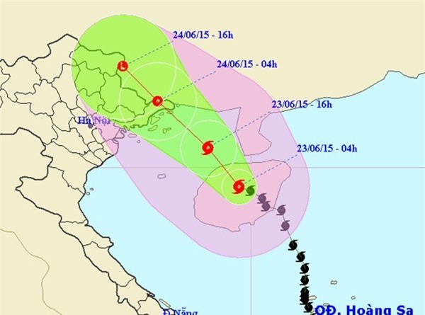 Như vậy sáng nay (23/6), vùng tâm bão sẽ đi vào vùng biển phía Đông Bắc vịnh Bắc Bộ. Đến 16 giờ ngày 23/6, vị trí tâm bão ở vào khoảng 20,5 độ Vĩ Bắc; 108,9 độ Kinh Đông, cách Móng Cái (Quảng Ninh) khoảng 180km về phía Đông Nam. Sức gió mạnh nhất ở vùng gần tâm bão mạnh cấp 8, giật cấp 9-10.