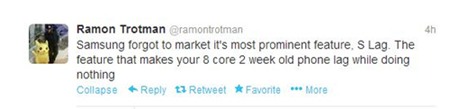 Dạo qua các diễn đàn di động lớn trên thế giới, không ít người dùng cũng gặp phải vấn đề tương tự với chiếc S4 dùng chip Octa 5. Thậm chí, một người dùng còn bức xúc gọi đó là tính năng “S Lag”: “Samsung đã quên không quảng bá cho tính năng quan trọng nhất của họ là S Lag - tính năng làm cho chiếc điện thoại 8 nhân mới dùng được 2 tuần bị lag trong khi chẳng thực hiện tác vụ nào cả”, thành viên có nickname Ramon Troman chia sẻ trên Twitter.