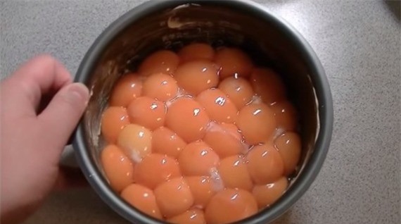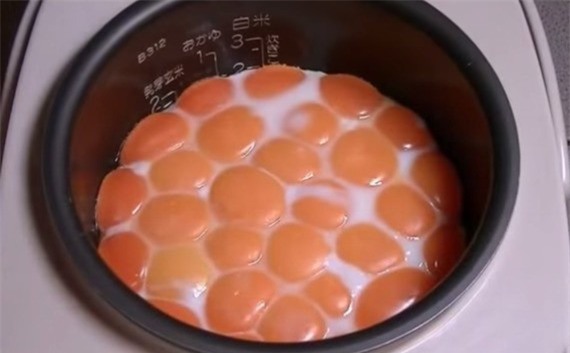 Chỉ cần cho hết 50 lòng đỏ trứng vào nồi cơm điện, sắp xếp ngay ngắn rồi bật nút nồi cơm mà thôi. (Ảnh: Internet)