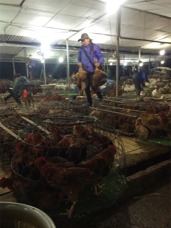 Tương tự, khu vực bán gà cũng có 4 dãy dài, với vài trăm ki-ốt bày bán đủ các loại, từ gà công nghiệp, gà ta thả vườn, gà đẻ thải loại cho tới ngan, vịt,... Số lượng gia cầm buôn bán mỗi đêm lên đến hàng trăm tấn. Tuy nhiên, lạ là chúng tôi không nghe thấy tiếng kêu của gà, vịt. Đặc biệt, tại đây dành ra hẳn một diện tích rộng hàng 100m2 để chuyên giết mổ gà vịt thuê cho các tiểu thương chợ lẻ, nhìn cực kỳ chuyên nghiệp.